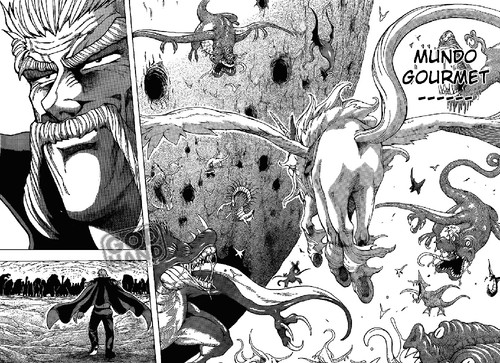 A segunda parte é quase equivalente ao encontro do Shanks e do Barba Branca, mas se calhar ainda numa escala maior. O pegasus que ele escolhe para o levar até à Bishokukai é um dos melhores monstros que o Shimabukuro criou, por contraste grande página com todos, ou quase, da bishokukai à espera do velho, faltou o Starjun e aquele parecido com um polvo que lutou com o Toriko. E com isso num curto espaço se reuniu um grupo incrível de personagens, a maioria dos personagens mais fortes do manga está ali e qualquer coisa que aconteça vai influenciar bastante o futuro do Universo de Toriko.