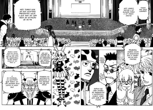 O capítulo desta semana focou-se principalmente na eleição, e o Togashi não mentiu, realmente este é o clímax da eleição, agora tudo irá ficar decidido, e continuou sem sequer fazer ideia de quem vai ganhar, isso é incrível, porque na maioria das histórias perto do clímax já se sabe quem irá ganhar, mas em Hunter x Hunter tanto pode ser a Cheadle, como o Parristan ou então haver surpresa e o Leorio se tornar o presidente ou quem sabe o meio apagado Mizaistom.