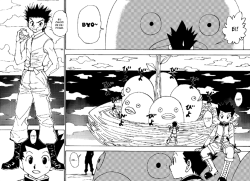 Antes de mais a arte melhorou do capítulo anterior para este, não está boa, mas pelo menos para os níveis de Hunter x Hunter está aceitável. Neste capítulo também teve um crossover com Gintama, porque esse pássaros são a cara da Elizabeth e o primeiro quadro da página dupla é idêntico.