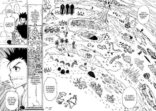 O Togashi praticamente desenhou tudo o que é conto sobre monstro nesse mundo, Kraken, Basilisk, Monstro do Log Ness, Dodo, Moby Dick, Dragões, Leviadã, Godzilla, uma Yggdrasil gigantesca, uma arena de combate, um buraco gigantesco no meio da Terra, uma Mão a sair da Terra, aqueles monstros gigantes negros, provavelmente no meio disso tudo deve estar a Atlântida e a Montanha do Sauren onde foi forjado o Anel do Poder.