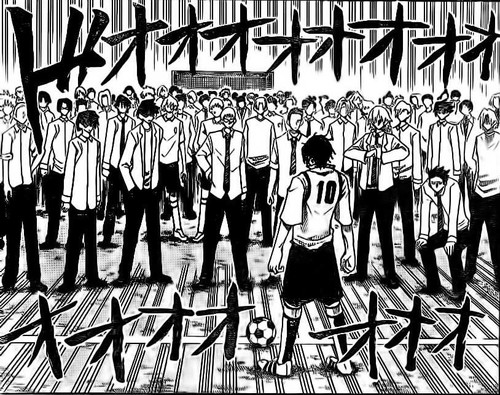 Continuando a ler o manga descobri que esse exagero é o de menor, o pior mesmo é ele desafiar toda a equipa da escola para um duelo, sim, 1 contra 11, a sério 1 contra 11, é impossível ganhar, nem o Messi conseguiria, e nem estou a falar do Messi contra uma equipa de futebol, mas sim contra onze Zés-ninguéns que não sabem jogar à bola. Mas o autor ainda acha que 11 contra 1 é uma cobardia para os 11, por isso junta mais uns quantos o que podem ver na imagem abaixo, mais ou menos uns 30 contra 1, agora sim já parecia justo, mas afinal ficou apenas pelo pareceu.