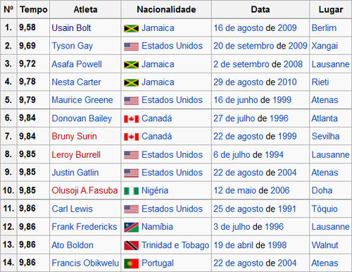 Eu quase que paro de ler o manga depois de que mencionam que no Universo de Light Wing há quem corra 100 metros em 9 segundos, para quem não tem bem a noção disso vou dar alguns exemplos, no Atletismo existe aquela mística por detrás da marca de 10 segundos, qualquer velocista quer obter essa marca, só depois disso se pode tornar um velocista de topo, ou seja estamos a falar de menos 1 segundo, isto de amadores, imaginem só quanto será que os velocistas correm nesse manga. Para terem uma noção olhem a imagem abaixo sobre os 14 velocistas que conseguiram fazer menos de 9,86, a qual é liderada por Ussain Bolt, o homem mais rápido do mundo, que faz miseros 9,58. Já agora fiquei surpreso com a marca do Obikwelu.