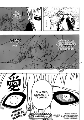 Mas colocando tudo isso de lado, o capítulo foi excelente, afinal tocou numa das melhores histórias de Naruto, a história do Gaara, que na minha opinião só perde para a história do Itachi. Não foi nada de especial, apenas mostrou um outro ponto de vista do passado do Gaara, o ponto de vista do pai, apenas com isso chegou para dar ao manga o ar do seu início, aquela fase tão boa, simples, mas excelente.