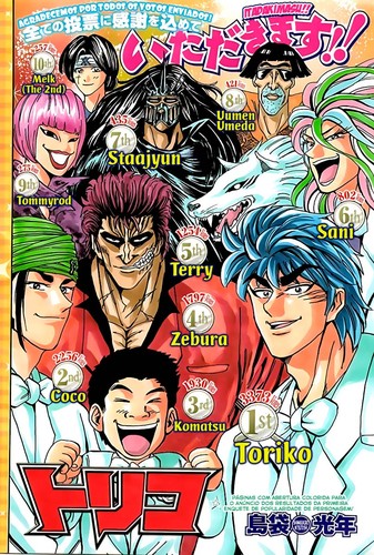 Com isto ia-me esquecendo do resultado da pesquisa de popularidade, Toriko em primeiro sem surpresas, já o segundo não posso dizer o mesmo não esperava que o Coco fosse tão popular, igual para o Komatsu, normalmente os personagens do seu tipo não o são, mas terceiro lugar é bom, para o segundo personagem principal de Toriko, esperava mais de Zebra, mas por outro lado é normal, afinal Zebra é um personagem recente, provavelmente na próxima ele ficará em segundo.