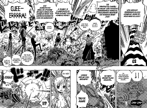 Mencionei no inicio a capa, mas a melhor página foi a página dupla final, com os mugiwaras todos juntos e ainda o Jinbei e a princesa. E já que o Oda os colocou ali começam novamente as suspeitas sobre o 10º mugiwara, gostava de ver o Jinbei no grupo, já a princesa não gostaria nada.