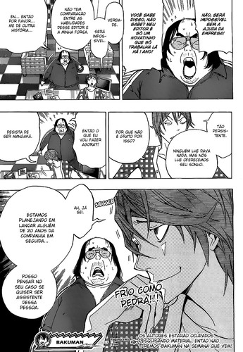 Por vários motivos que já falei anteriormente este arco não pode ser considerado bom, mas não quer dizer que algumas ideias não sejam boas, só não fazem é sentido algum em Bakuman e nem adiantam nada há história. Este capítulo salvou pelo flashback do tio do Mashiro, só não gostei do facto de tudo parecer meio forçado, algo que o próprio Takagi comentou: