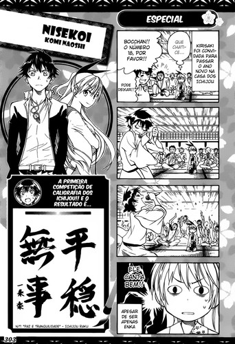Antes de mais Nisekoi não está rankeado, porque só tenho um omake para comentar, também foi colocado neste lugar para separar Naruto e Bleach. Apesar de também ir comentar um pouco sobre o omake o que tenho principalmente a dizer é sobre alguns spoilers que li sobre alguns futuros capítulos, não vai ter spoilers, apenas comentando um factor importante.
