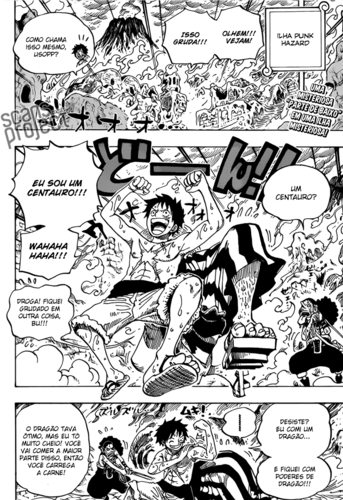 Mais um excelente capítulo de One Piece, mas sem muito o que comentar. O capítulo começa com o Luffy fazendo mais uma das suas maluquices/bizarrices, agora usando as pernas do novo personagem para se transformar num centauro, muito bizarro.