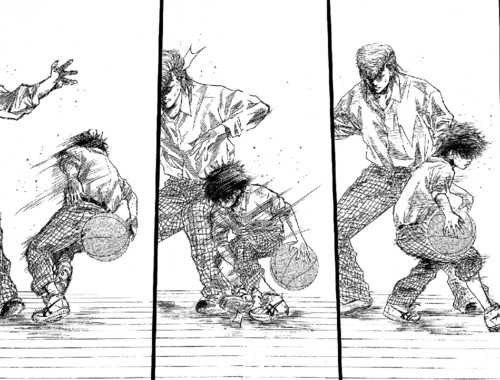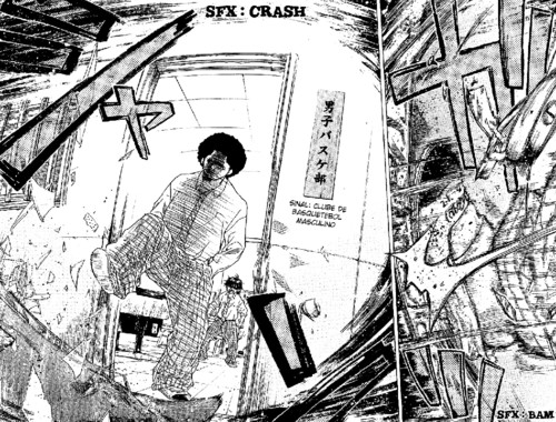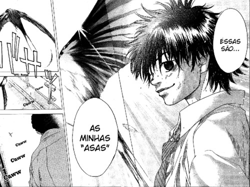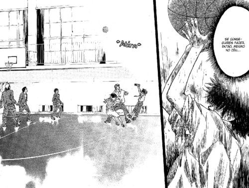 Praticamente seguido da página que ele atira de 3 pontos, vem outra grande página, com ele finalmente mostrando o que eram as suas tais asas, que tinha sido mencionado no capítulo anterior, asas quais que significam a sua maneira de jogar e conseguir chegar ao cesto, se as asas dele são os 3 pontos, as asas do Hanamichi por exemplo são o seu grande salto, que ganha qualquer ressalto.