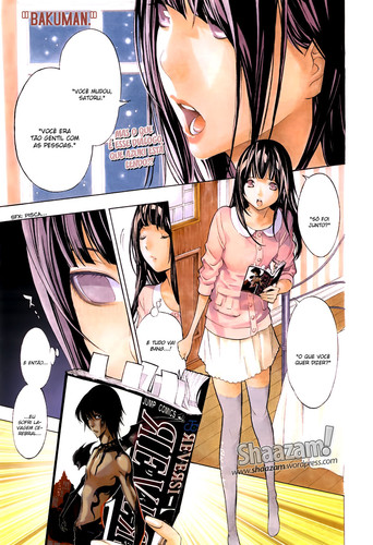 O manga começou bem, com páginas coloridas, a página dupla podia ser melhor, mas também não é por aí que vou criticar. Depois foi aquela conversa entre o Ashirogi Muto e o Hattori, que tem sido tão habitual durante os capítulos anteriores, pelo menos desta vez o Ohba não decidiu inventar mais alguma coisa sem noção para o Hattori dizer.