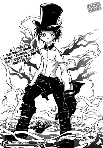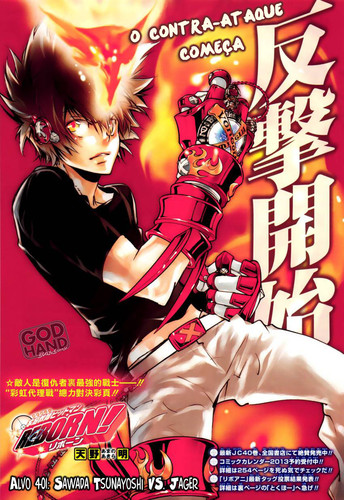Antes de mais, a Amano foi bem criativa com a página colorida, por alto conto pelo menos umas 5 páginas coloridas, fora capas e especiais, com o Tsuna nessa mesma posição.