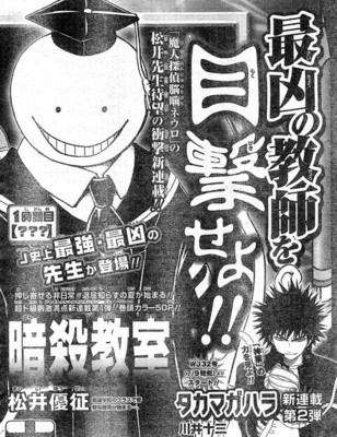 A capa e o destaque vai para Assassination Classroom, novo manga do autor de Neuro, manga que foi publicado há alguns anos atrás na Jump e é meio que um dos mangas favoritos do público da internet, pessoalmente ainda só li um volume e meio, então ainda poderá ser cedo para julgar o manga. Sobre esse novo manga, gostei do nome, fez-me lembrar da Sala da Verdade, manga fictício de Bakuman, além disso confiando em tudo o que dizem sobre Neuro, espero um manga bem interessante.