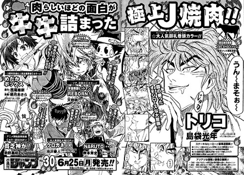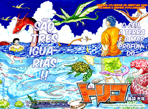 Toriko ganhou capa, excelente e bem criativa, até mesmo a página dupla colorida ficou excelente, o que não é normal em Toriko, que um dos maiores defeitos sempre foi a arte, principalmente quando colorida. Capítulo de final de arco e inicio de um novo, com mais um daqueles encontros épicos que o Shimabukuro sabe fazer tão bem. O Novo Mundo parece que está cada vez mais perto.
