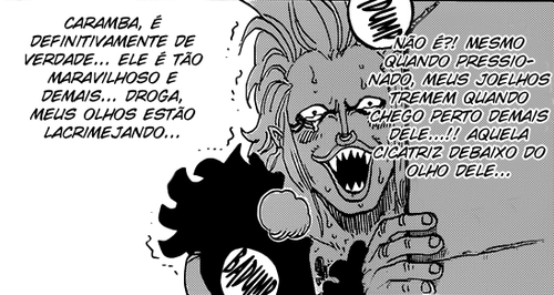 Introdução para explicar o porquê das diferentes opiniões em aspectos tão parecidos, apesar de que no caso em particular deste capítulo nem sequer é o Luffy que tem o destaque cómico do capítulo, mas sim o seu maior fã, Bartolomeu. Toda a situação foi bizarra ao extremo e bizarro é um dos maiores pontos fortes de One Piece, quando bem feito claro, o Bartolomeu até ao momento vinha sendo um personagem chato a todos os níveis e dada a sua importância para a história isso é algo quase impensável, um personagem que deve ter tanta importância neste arco não agradando praticamente nenhum fã do manga, logo só vejo esta mudança na personalidade do personagem como algo benéfico para o manga, já que torna o personagem interessante, falo por mim não estava a gostar nada do Bartolomeu e agora estou bastante curioso sobre o seu futuro. E toda a situação cómica envolvida tornou tudo ainda melhor, Bartolomeu como o grande fanboy do Luffy é épico e isso ainda dará muito o que falar. Não me lembro da última vez que me tinha rido tanto com um capítulo de One Piece.