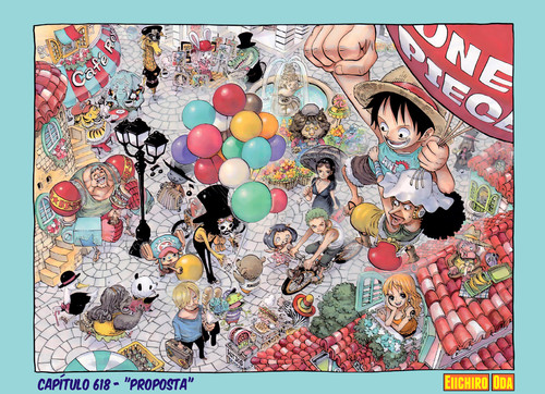 Antes do capítulo esta semana One Piece teve página colorida e como sempre sai uma daquelas páginas coloridas duplas, que na verdade nada tem a ver com a obra, mas pouco importa aos fãs, porque são sempre bem feitas. Esta nem é das melhores, na minha opinião, mas não deixa de ser boa.