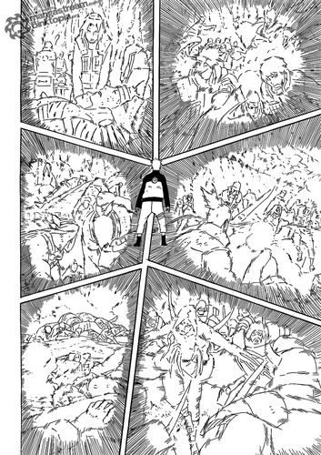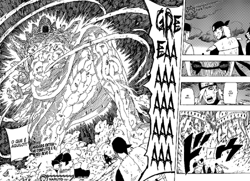 A segunda parte é essa imagem acima, é certo que Kishimoto não desenha bem, quem dizer o contrário ou é fã ou nunca leu nenhum manga além de Naruto, e essa imagem parece mais um esboço que outra coisa, mas isso não lhe retira o toque de épico, com Naruto a sentir todos os sentimentos e emoções de todos os envolvidos nesta guerra. Para além disso, Naruto está super forte e vai em direcção à guerra, pronto para acabar todo o mundo que lhe aparecer à frente.