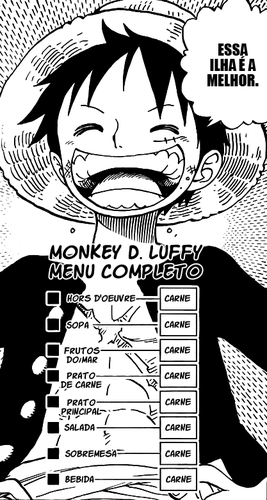 O capítulo começa com Luffy deitado nos ramos de uma árvore, quando do nada começa a chover, nada mais nada menos que carne. E como o Luffy é comeu até encher, nessa parte da história é mostrado o menu completo do luffy, para quem nunca leu Toriko, isso é uma das coisas mais importantes da história, todos os bishokais, ou caçadores de comida, procuram o seu menu completo. Mas o menu do luffy é simples, carne para todas as categorias.