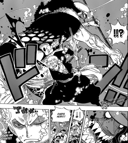 Mas o capítulo não fica apenas pela lembrança do passado, o capítulo é realmente excelente, como Oda sabe fazer. Começa logo respondendo à minha pergunta/crítica, sobre a luta entre Zoro e Hodi, o que eu estava a criticar era o facto de Zoro ganhar ao Hodi dentro de água, facto que alguns tritões até chegaram a apontar neste capítulo, como era possível um humano ganhar a um tritão dentro de água? Mas parece que Oda se lembrou que Zoro também precisa de respirar e pelos vistos já não tenho o que reclamar, afinal Hodi está a ganhar dentro de água. Resumindo para mim Zoro ganhar fora de água nada mais que normal, mas dentro de água um tritão tem de ganhar para não envergonhar a sua espécie.