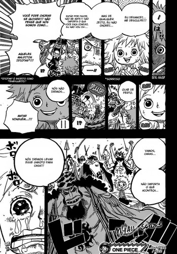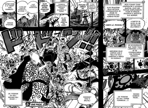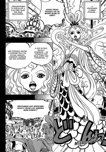 Sobre o manga, as primeiras páginas são para retratar como está a ilha dos tritões, resumindo uma confusão. Os piratas do Hodi são os culpados, mas pensam que os mugiwaras também estão metidos nisso, eles estão a colocam terror por toda a ilha e os príncipes estão tentando conter o Hodi e a sua tripulação, respondendo a alguns comentários que vi pela net, a perguntar onde eles estavam. Para piorar ainda mais, no meio da confusão o Caribou aproveita para raptar sereias com o seu poder, com os mugiwaras sendo culpados mais uma vez.