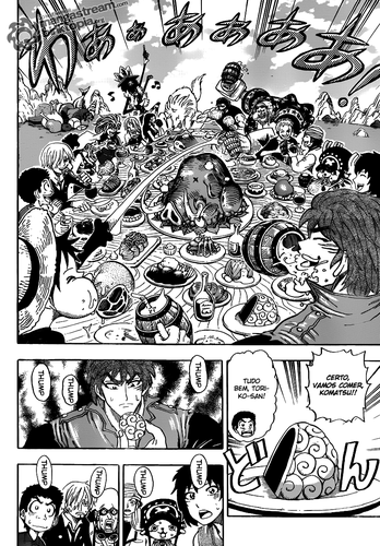 Com o tempo daquela ilha ninguém passa fome. Komatsu lá consegue dar bom sabor a fruta do diabo e depois todos se juntam bem ao estilo Asterix e Obelix com um banquete, só falou os javalis. Para o banquete foram convidados a tripulação do Luffy e os 4 reis celestes, que dá um grande spoiler, para quem não acompanha Toriko a par com o Japão, seguindo ainda as traduções da God Han Scans, como eu.