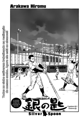 Sobre os capítulos, no 60 a autora quis fazer comédia em vez de mostrar o jogo, até aí tudo bem, o problema é que isso acabou apenas servindo para duas coisas, estragar o jogo de basebol e estragar os partos dos animais. No 61 a autora continua na mesma linha de raciocínio e faz o clube perder, tudo bem, ainda para mais tendo em conta o que se seguiria, a derrota faz sentido, mas esse anti-climax num manga como Gin no Saji acaba soando estranho, principalmente tão perto de um final de arco. O capítulo 62 foi meio aleatório e saindo totalmente do plot principal, mas acabou sendo o melhor dos 4 e a autora até podia ter escolhido o queijo para terminar o arco, mas como se veria no 63 este sem dúvida não seria um arco com festa no final. Capítulo de drama e dessa mesma maneira que termina o arco, não servindo como um fecho de arco, mas sim como um arco de passagem de 32 capítulos, terminou bem, mas para um manga como Gin no Saji uma festa no final é uma solução melhor do que o drama, quer drama então tem de voltar a fazer algo do nível de Full Metal Alchemist, Gin no Saji é a típica história feliz e fugir disso é estranho.