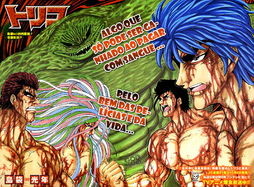Depois de uma semana menos boa para Toriko, que acabou saindo do bottom, a Jump deu-lhe página colorida de abertura, apesar de a capa ter ido para Gintama e Medaka Box. Por um lado penso nisso como algo positivo, se não estou errado One Piece este ano ainda não ganhou nenhuma capa a solo, já que acaba sempre por ganhar destaque nas issues duplas, então Toriko estaria seguindo o caminho de One Piece, isso é algo que até faz sentido se pensar-se que Toriko só teve uma página colorida dupla, em vez de 3 páginas que é o normal, sendo que apenas One Piece opta por essa estratégia.