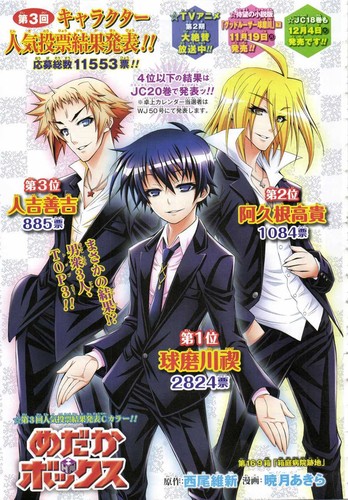 Haikyuu ganhou mais uma página colorida e é como já venho dizendo é bom que a Jump o faça, até ao momento não desiludiu na qualidade e de certeza no futuro irá render um bom dinheiro, como Kuroko está fazendo hoje em dia, é só não deixar que se afunde, como na maioria das vezes a Jump faz. Medaka também ganhou página colorida, pelos vistos com o resultado do concurso de popularidade, meio surpreendente a protagonista não ficar no top3, mas sem surpresas no primeiro lugar. Saiu mais um one shot, mas não sei do que se trata, já o da semana passada achei bem interessante, mas não acho que combine com a Jump, apesar de que já houve mangas desse tipo a durar bons volumes na Jump.