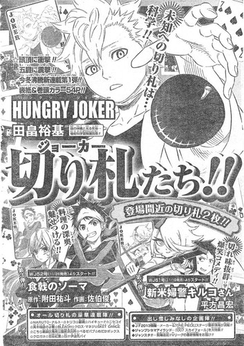 Nas próximas semanas, na edição 51 estreia um manga policial, do qual não sei muito, mas que a arte não me chamou muito à atenção e na edição 52 estreia Shokugeki no Soma, manga de culinária já aguardado por muitos, do mesmo autor de Shonen Shikku, um daqueles mangas de futebol cancelados pela Jump e de um autor de hentai, manga ao qual prevejo que ou se torne um novo Medaka, adorado por uns odiado pelo resto, ou que acabe cancelado o mais rápido possível.